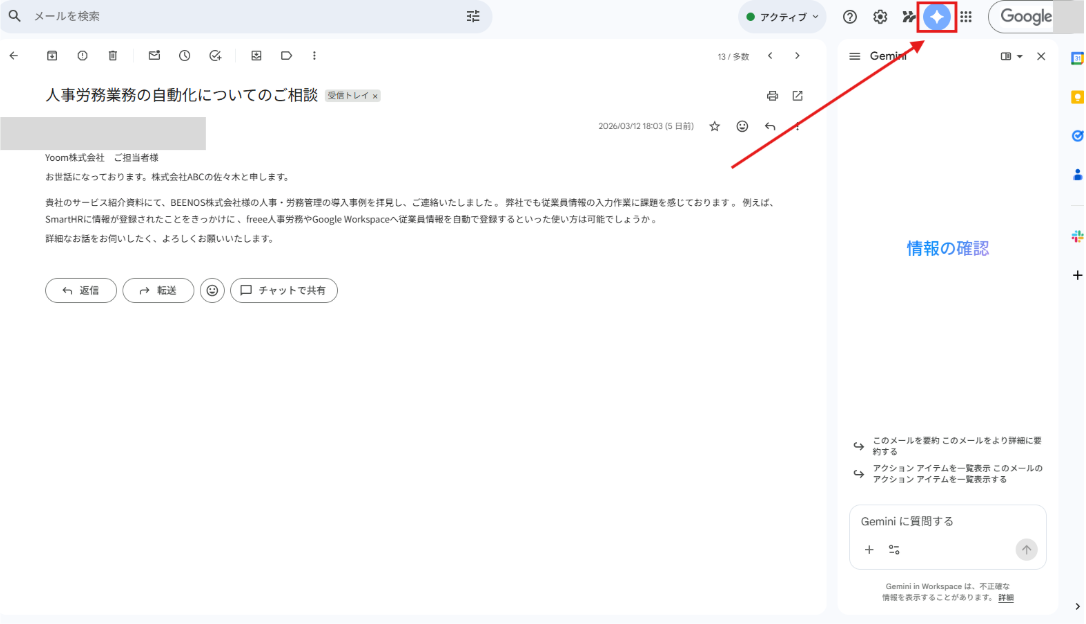 検証手順 まずは右上のGeminiマークを押し、Gmailの画面上でGeminiを呼び出します。
