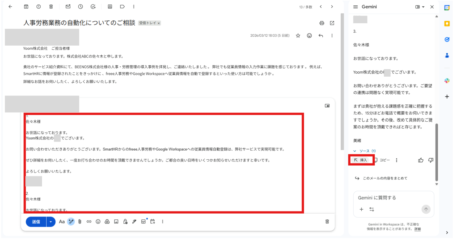 元の文脈を読み取った丁寧なドラフトが一瞬で作成されていることが分かります。最後に「挿入」ボタンを押すと、返信文案が入ってきます。コピペ作業も不要でメール返信文を入れ込むことができました!※利用には特定のビジネスライセンスが必要です