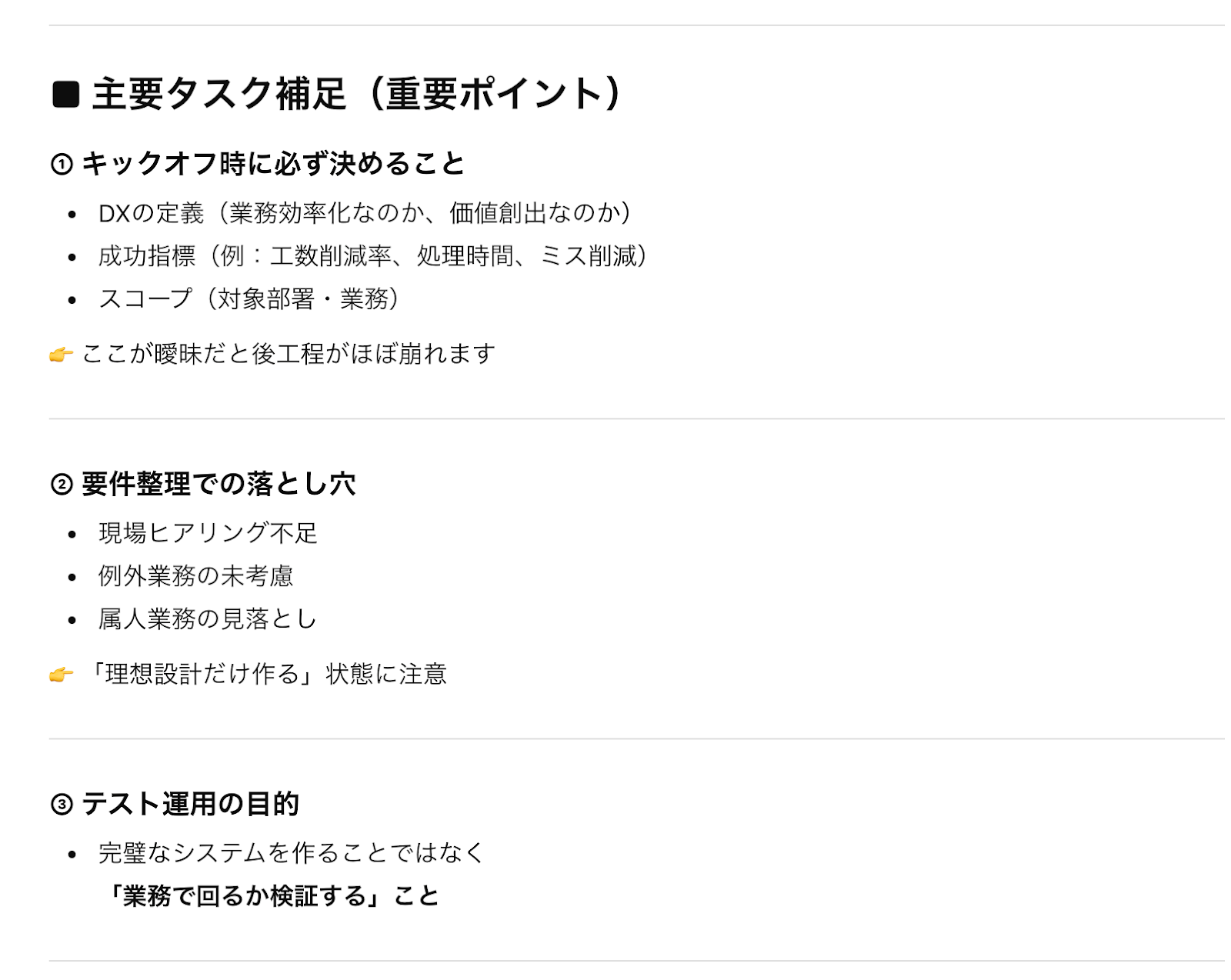 また、キックオフ時に必ず決めることや要件整理での落とし穴など、主要タスクの補足まで列記してくれます!