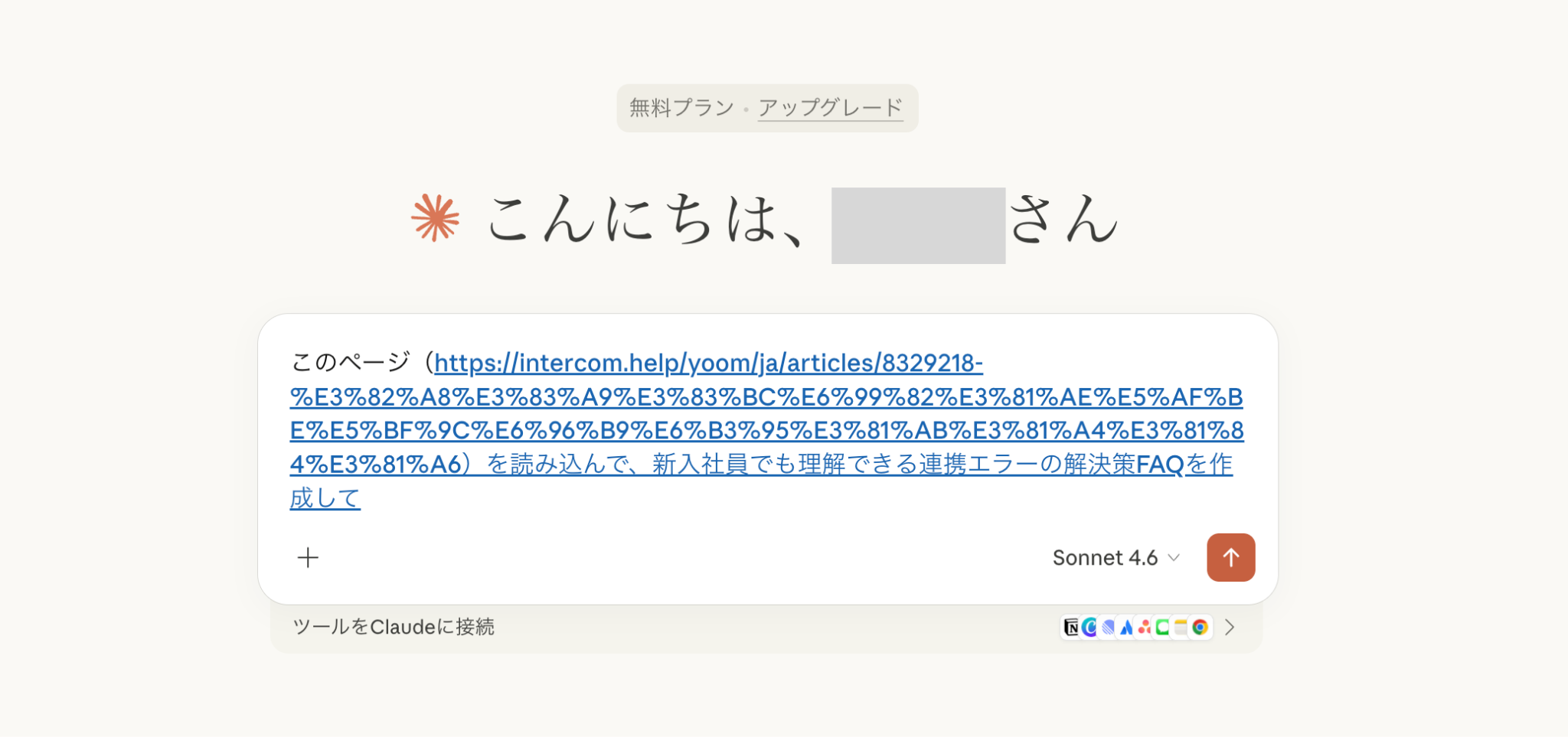 検証手順 Yoomのヘルプページを読み込ませ、新入社員でも理解できる連携エラーの解決策FAQを作成してと指示します。