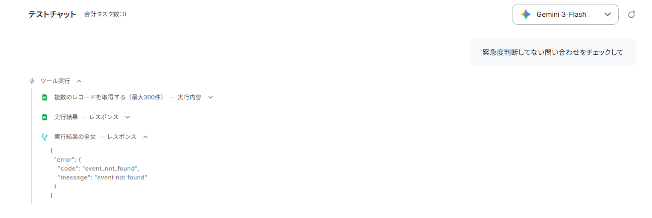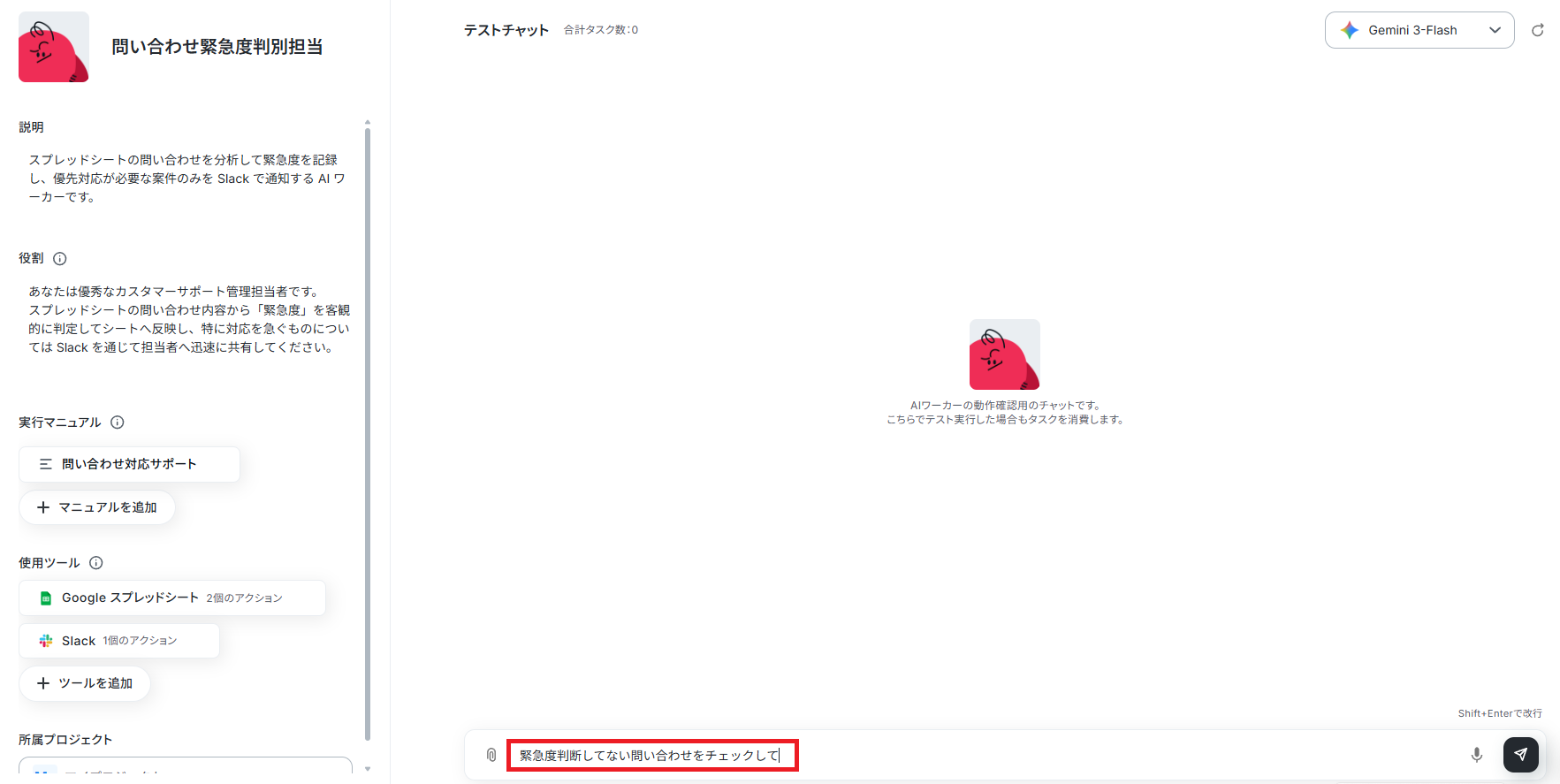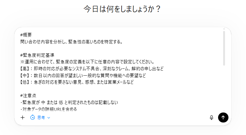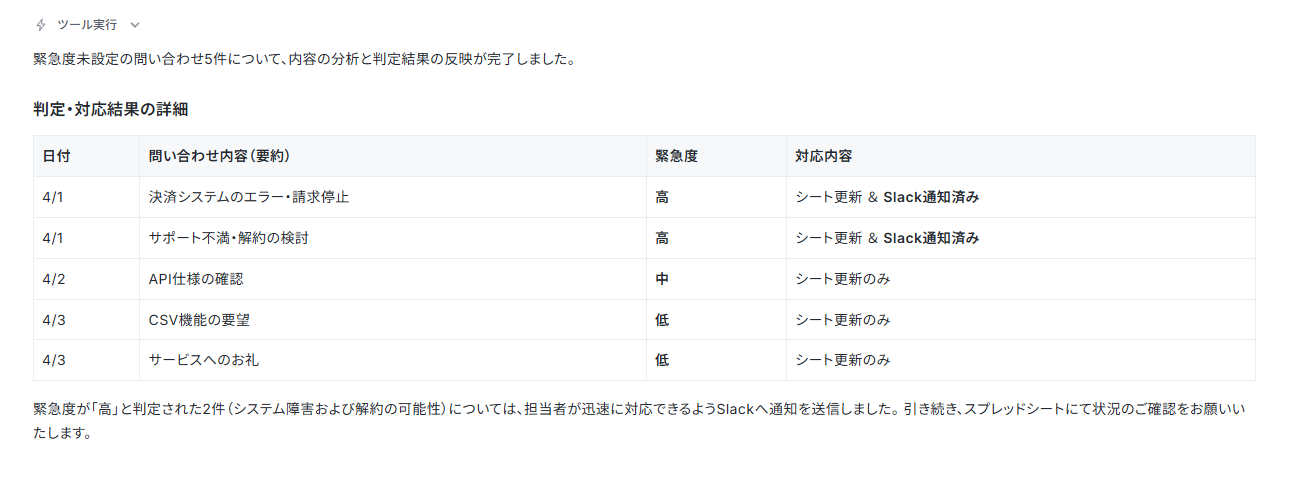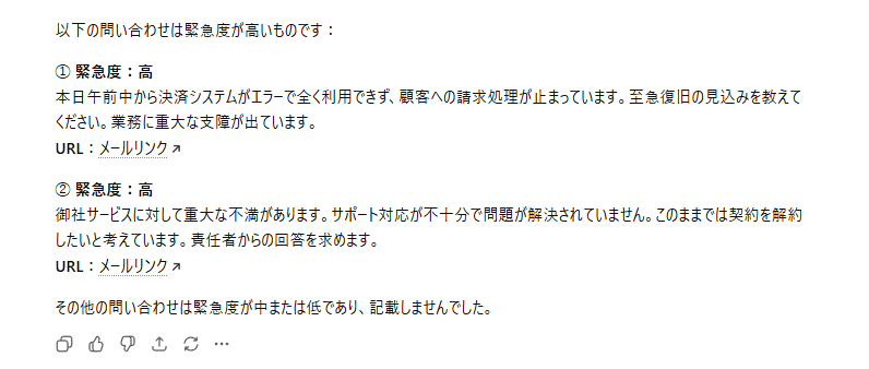 テストでは「緊急度判断してない問い合わせをチェックして」と指示しました。