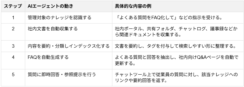 社内に散在する情報やノウハウを整理・活用する「ナレッジ管理」の領域に自律型AIエージェントを活用するケースです。議事録、マニュアル、チャットログなどからAIが自律的に情報を集約し、検索しやすい社内ナレッジベースとして整理・更新してくれます。
