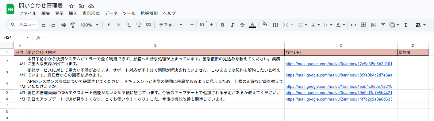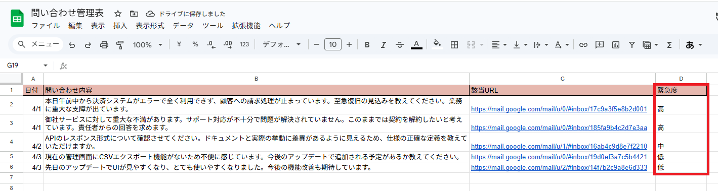 Google スプレッドシートの問い合わせ一覧を分析し、緊急度の高いものをSlackで通知するAIワーカーです。
