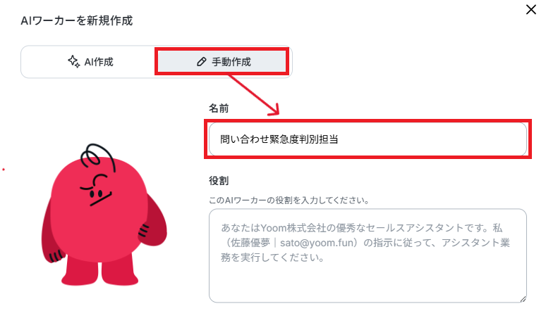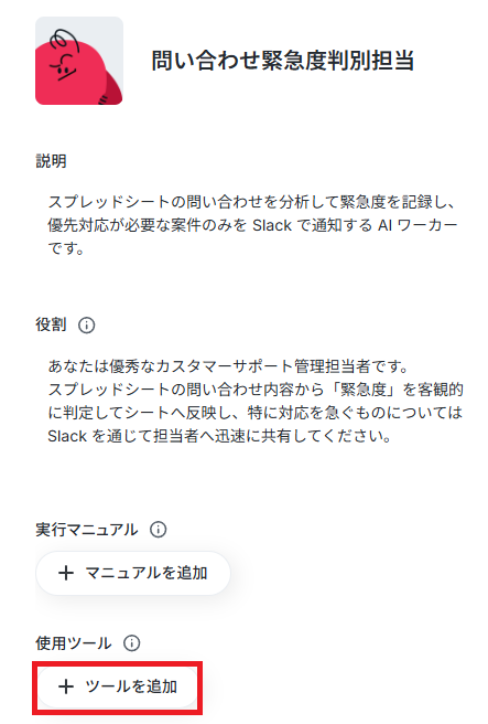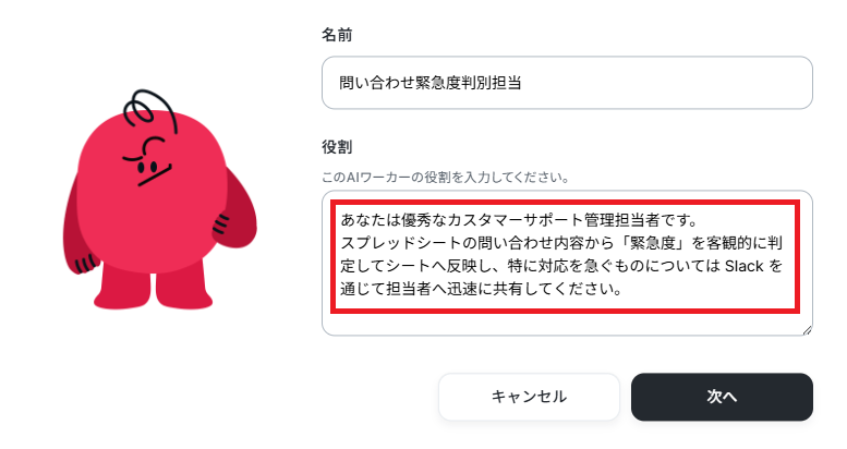 今回は問い合わせ管理を目的とするため、ワーカーの名前を【問い合わせ緊急度判別担当】にしました。なお、名前やキャラクターは後で修正することもできます。