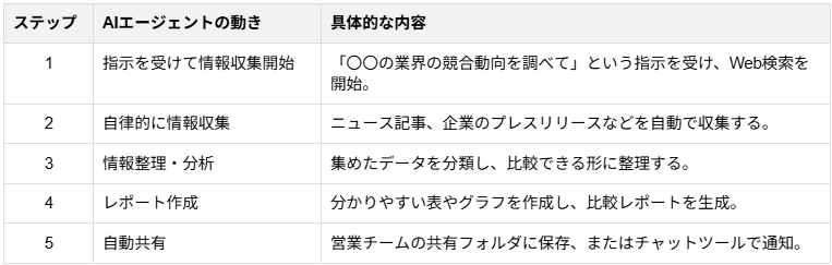 営業活動において、見込み顧客の調査や競合情報の収集は重要ですが、非常に時間がかかる作業です。自律型AIエージェントを活用すれば、このようなリサーチ業務を完全に自動化できます。