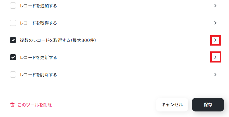 AIワーカーに許可するアクションは、「複数のレコードを取得する(最大300件)」と「レコードを更新する」を選択して右の矢印をクリックします。