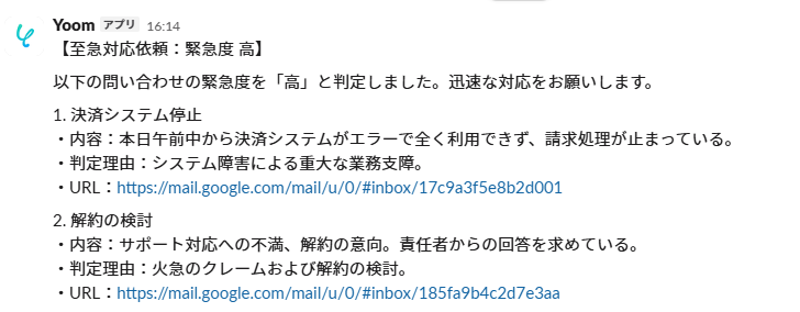 Slackを確認すると、指示通り「内容要約」や「判断理由」が記載された通知が届きました。