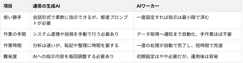 検証を通じて、通常の生成AIとAIエージェント(AIワーカー)の決定的な違いは、「情報の処理だけで終わるか、実務のプロセスまで踏み込むか」という点にあることが明確になりました。