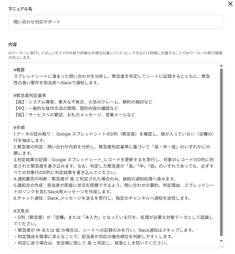 このように細かく定義することで、AIワーカーの判断のブレがなくなり、正確で質の高い業務を遂行してくれるようになります。