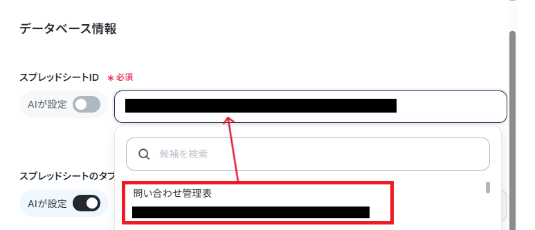 今回は手動で設定を行うので、トグルを押します。入力欄をクリックすると、アカウント情報に紐づいた候補が表示されるので、問い合わせ記録シートを選択します。