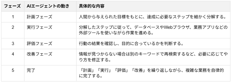 自律型AIエージェントが自ら考えて行動する裏側には、高度な推論能力と計画機能が備わっています。分類すると以下のフェーズに分けられます。