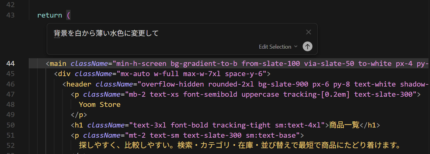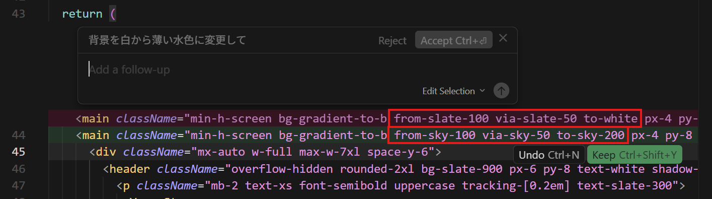 実際に試してみましょう。修正したいコードのブロックを選択した状態でCtrl+Kを押し、「背景を白から薄い水色に変更して」といった言葉で指示を出します。