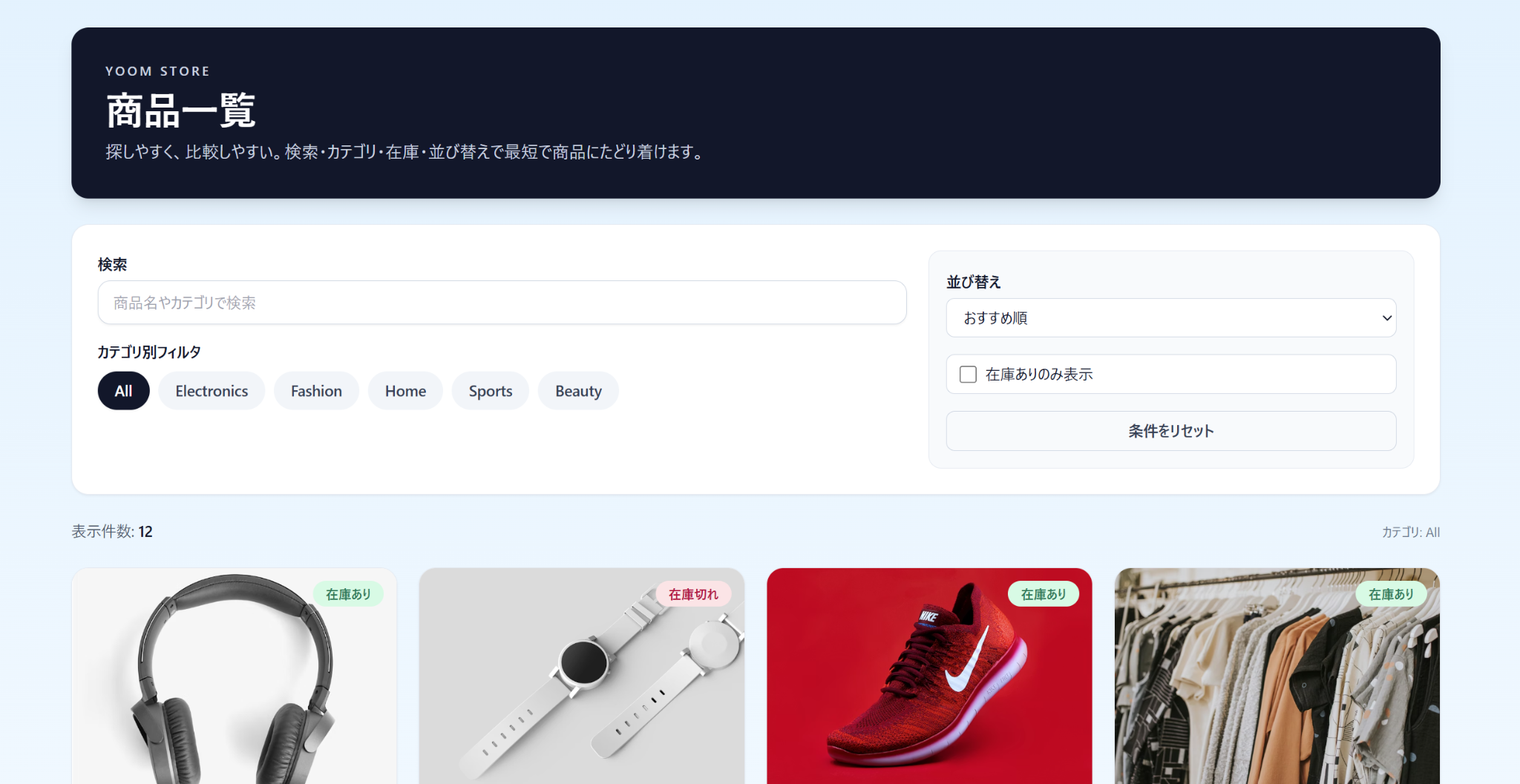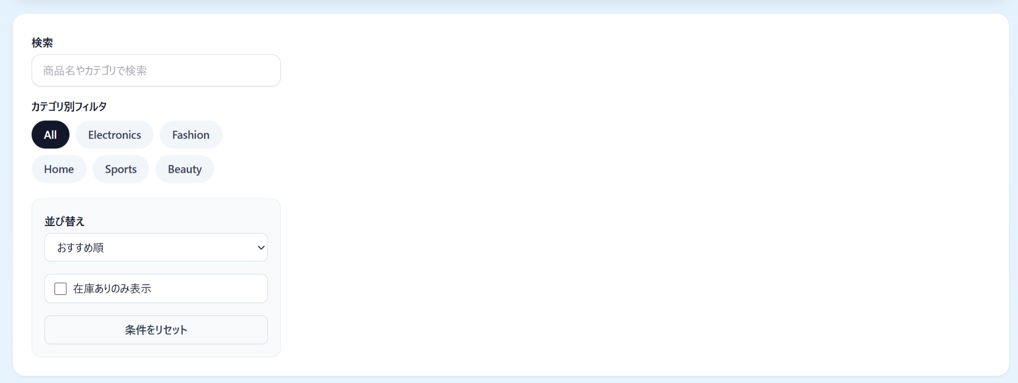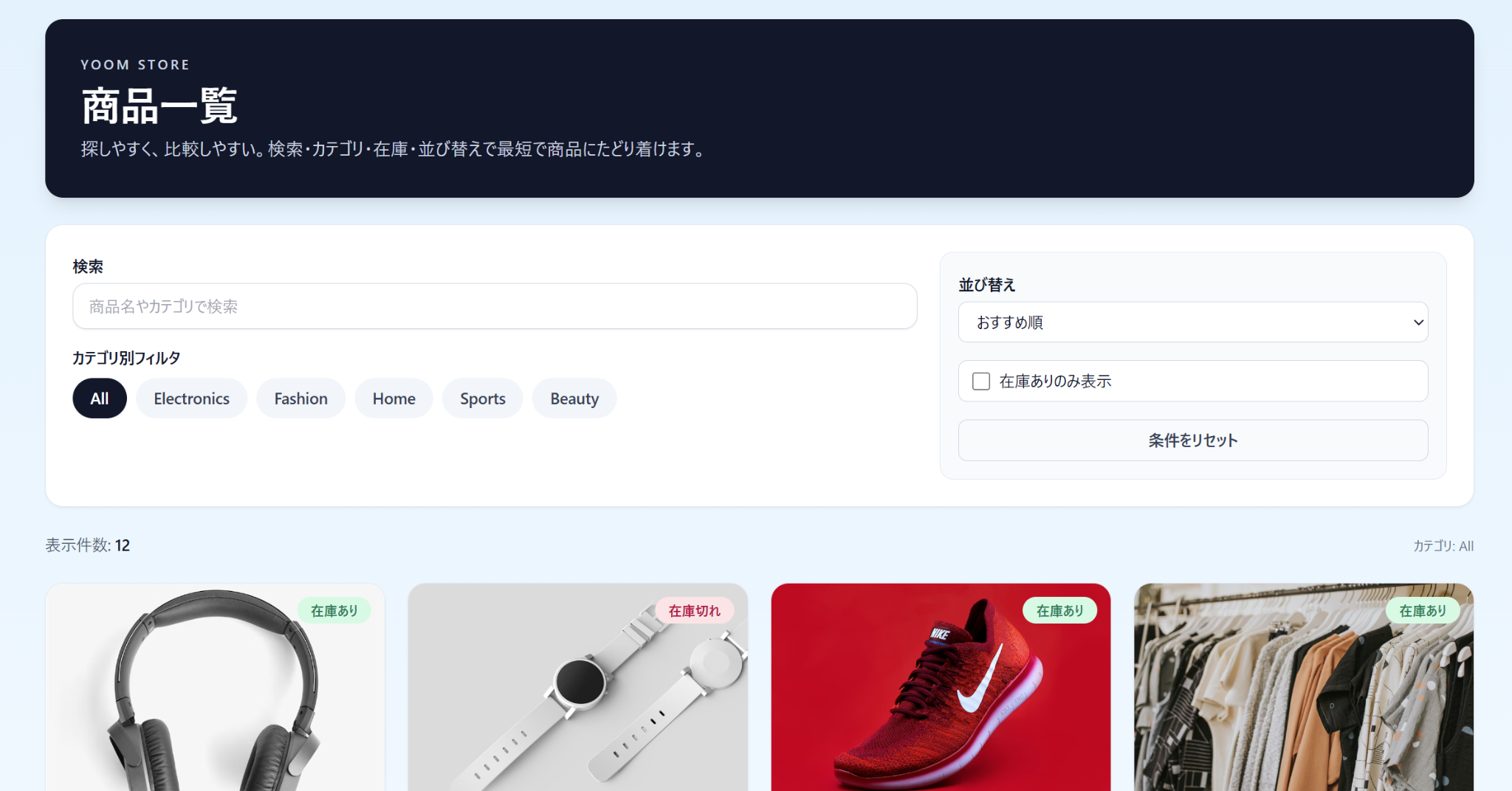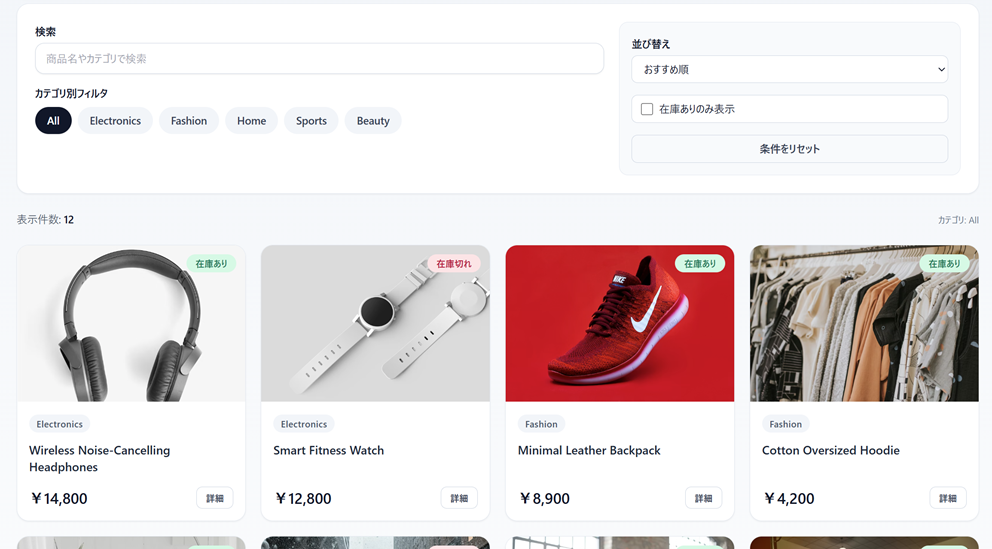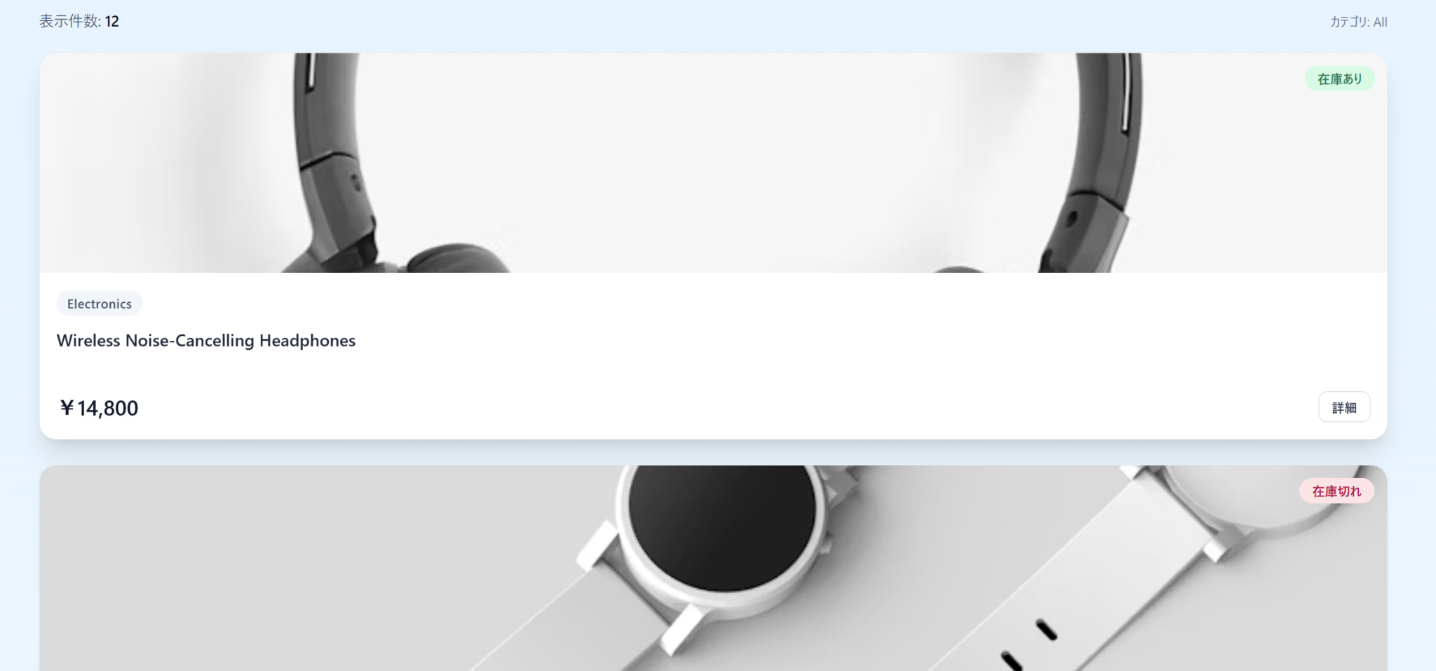 フロントエンド開発において、一般的な商品一覧の画面を作るには「商品データの定義」「一覧を表示するコンポーネント」「絞り込みのロジック」「レスポンシブなUIデザイン」など、考えるべき要素が多岐にわたります。