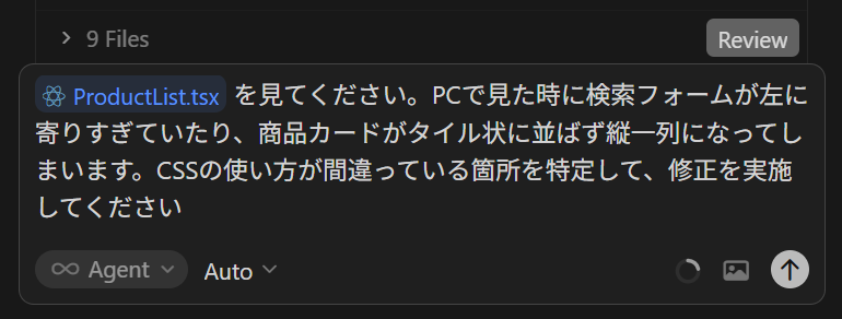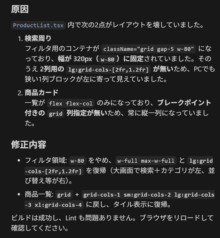 「@ProductList.tsx を見てください。PCで見た時に検索フォームが左に寄りすぎていたり、商品カードがタイル状に並ばず縦一列になってしまいます。CSSの使い方が間違っている箇所を特定して、修正を実施してください」と指示を出しました。