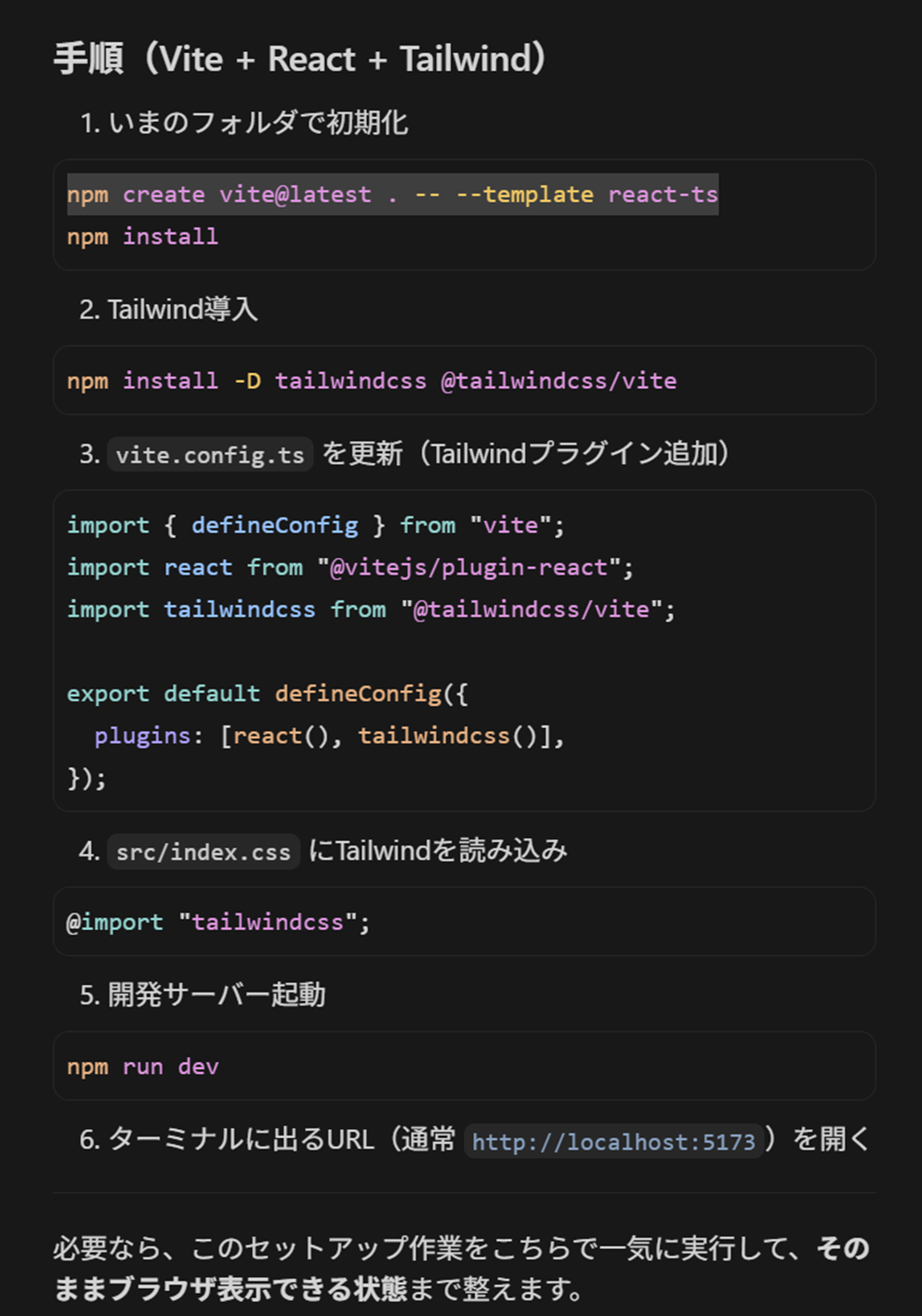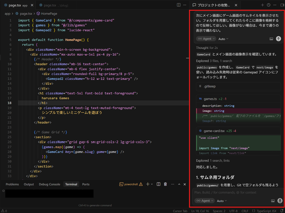 Cursorを使えば、詳細なプロンプトを投げるだけで一通りの構造が数分で組み上がります。「どこから手をつければいいか」と悩む時間を、生成された土台を「どう良くしていくか」を考える時間に転換できるため、プロジェクトの初動が格段に早くなります。