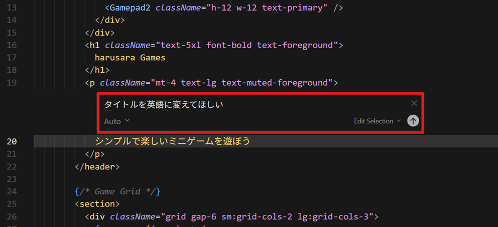 ブラウザでプレビューを確認しながら、「もう少し余白が欲しい」「ボタンの色を変えたい」といった局所的な変更を加える場合には、インライン編集(Ctrl+K)が役立ちます。