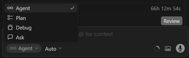 現在のCursorでは、チャット欄(Ctrl + L)の上部にあるメニューから、目的に合わせてモードを切り替えることができます。
