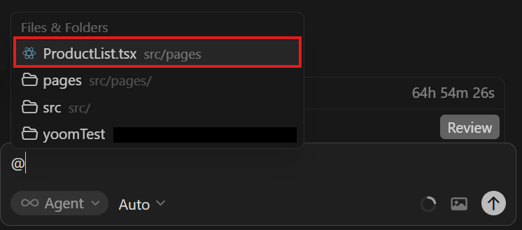 Cursorのチャット欄で「@」と入力すると、プロジェクト内のファイル一覧が表示されます。
