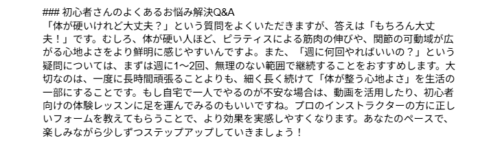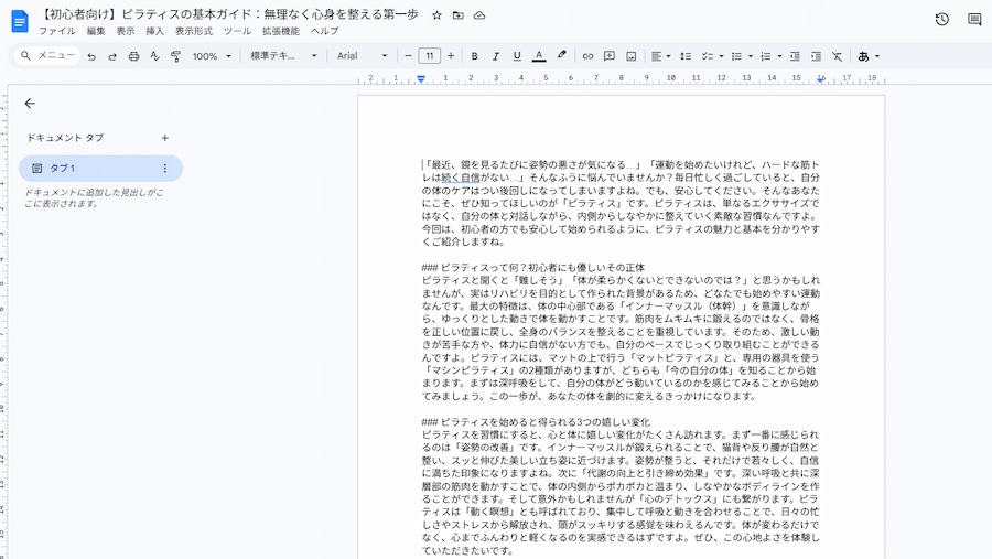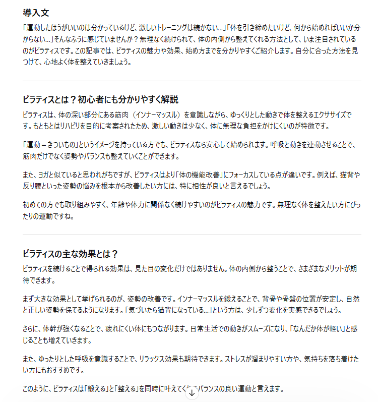 テストでは「“ピラティス”というキーワードで、初心者向けの解説ブログ記事を作成してください」と指示しました。