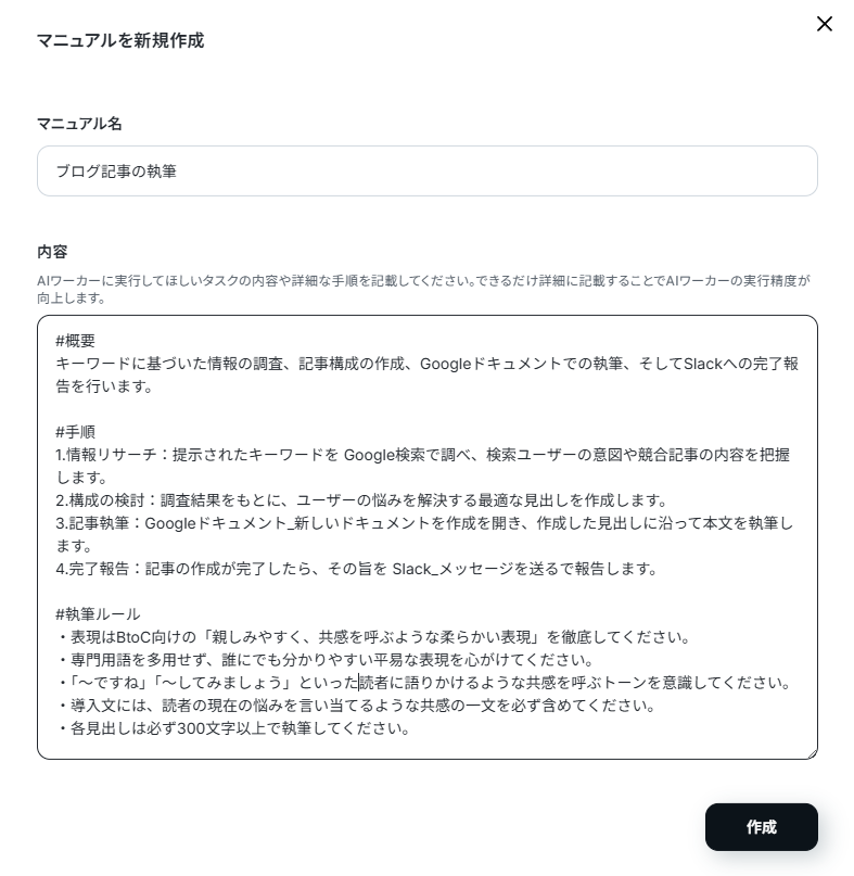 このように細かく定義することで、AIワーカーの判断のブレがなくなり、正確で質の高い業務を遂行してくれるようになります。