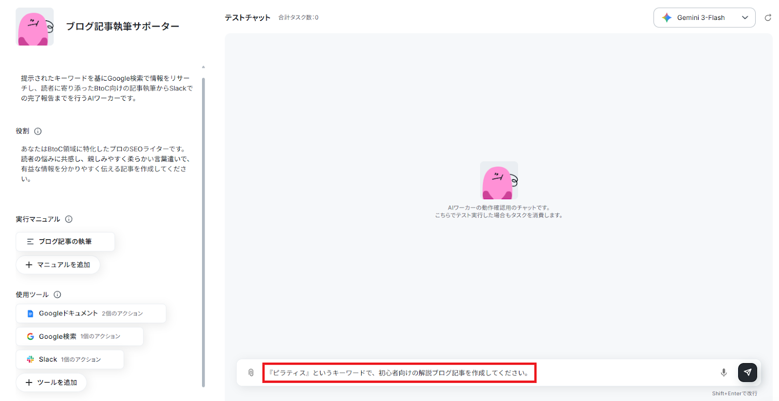 すべての設定が完了したら、チャット画面から実際に指示を出してみます。