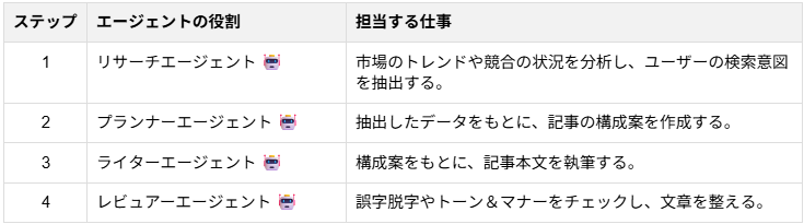 コンテンツマーケティングの領域では、質の高い記事やSNS投稿を継続的に発信し続ける必要があります。そんな時、マルチAIエージェントを活用すれば、以下のような手順を自動化できます。