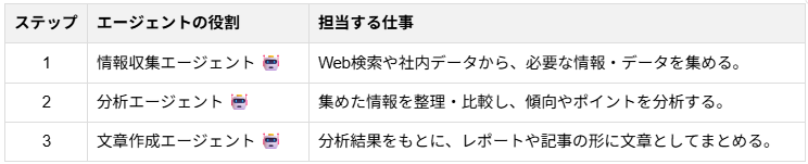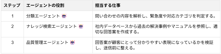 このように、複雑な業務プロセスを細かいタスクに分解し、それぞれに特化したAIを割り当てることで、全体として非常に高度な処理を実現しています