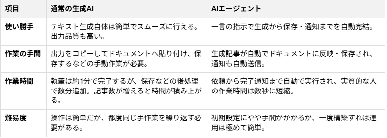 このセクションでは、先ほど実際に作成した「ブログ記事作成のAIエージェント」と通常のAIを使って、使い勝手や効率にどのような違いがあるかを比較します。
