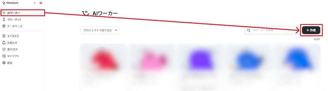 まずはYoomの操作画面から「AIワーカー」から「+作成」をクリックします。