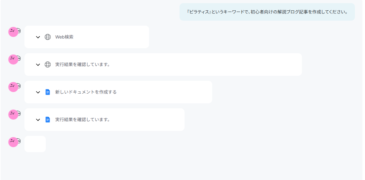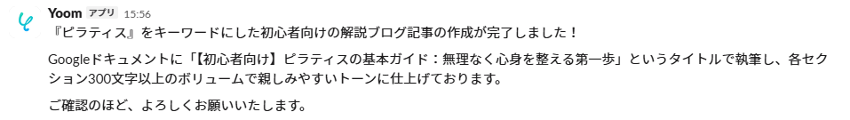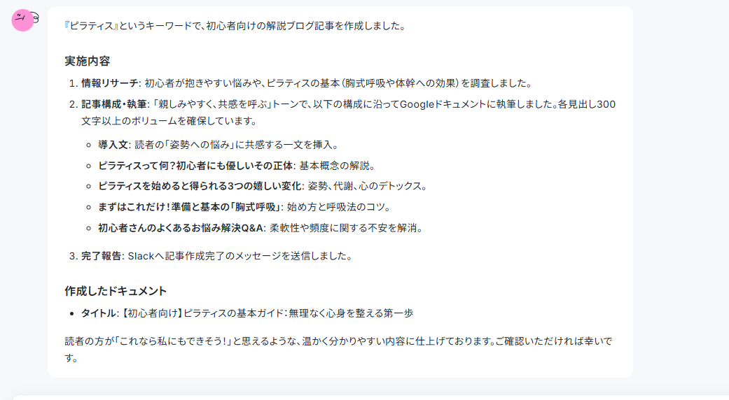 Google検索でリサーチした後にGoogleドキュメントで執筆後、完了報告をSlackに通知するところまで自動化できます。