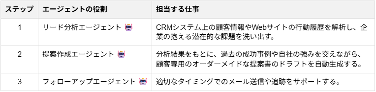 BtoBの営業活動においては、顧客ごとの課題に寄り添ったパーソナライズされた提案が成約率を大きく左右します。マルチAIエージェントを導入した営業プロセスは以下です。