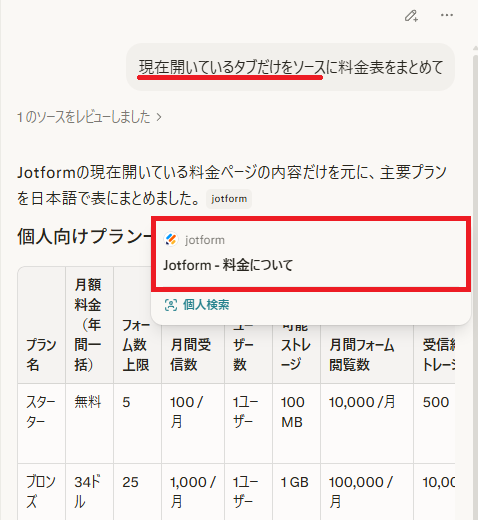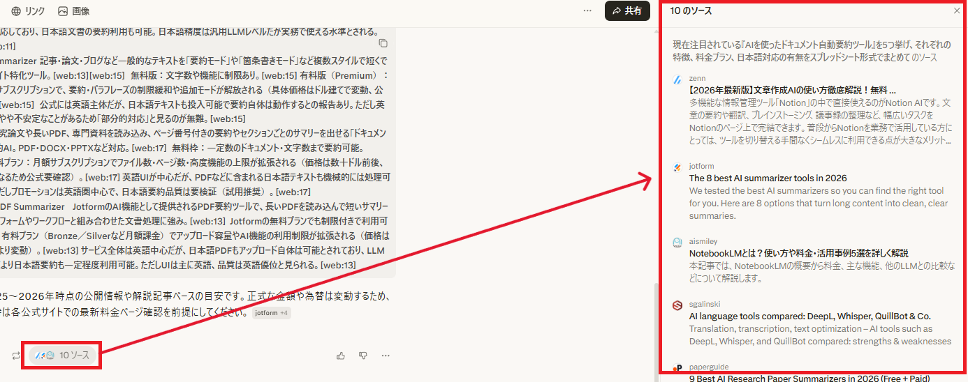 厳密な正確性が求められる局面では、公式サイトを開いたうえで「開いているタブの内容だけをソースにする」といった詳細指示を併用することで、情報の精度をさらに高められます。