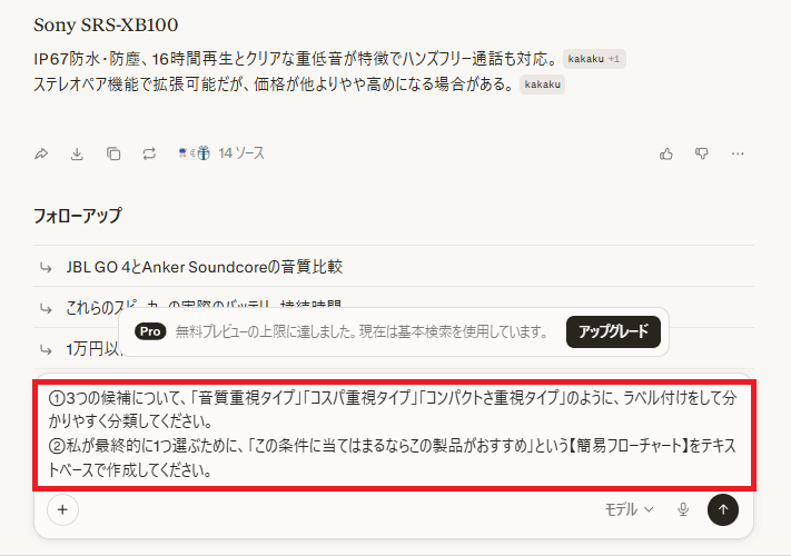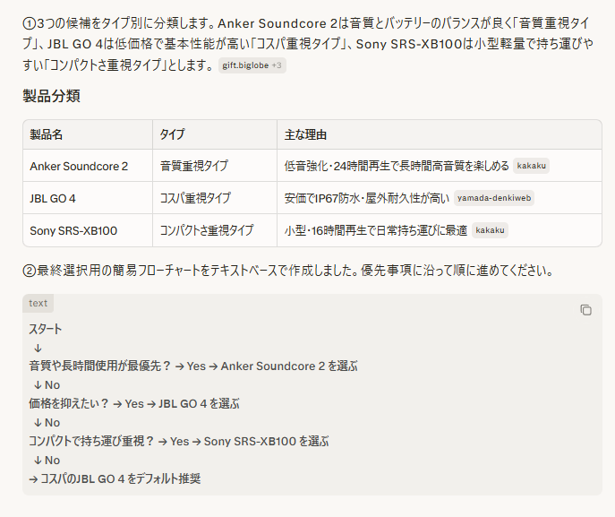 「音質重視」「コスパ重視」といったラベル付けによって各製品のキャラクターを際立たせ、最終的に「Yes/No」で進むだけで自分に最適な1台に辿り着けるフローチャートを生成。リサーチから最終的な背中押しまで、Comet AIは極めて優秀なコンシェルジュとして機能することを確信しました。