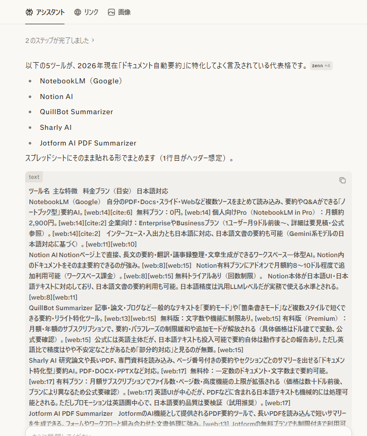 テキストはそのままコピー&ペーストするだけで、即座に会議資料として成立するレベルの表が完成しました。