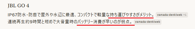 単なるカタログスペックの引用ではなく、「バッテリー消費が激しい」「低音は強いがポータブル性に欠ける」といった、数多くのレビューを読み込まなければ抽出できない実務的なメリット・デメリットが言語化されています。