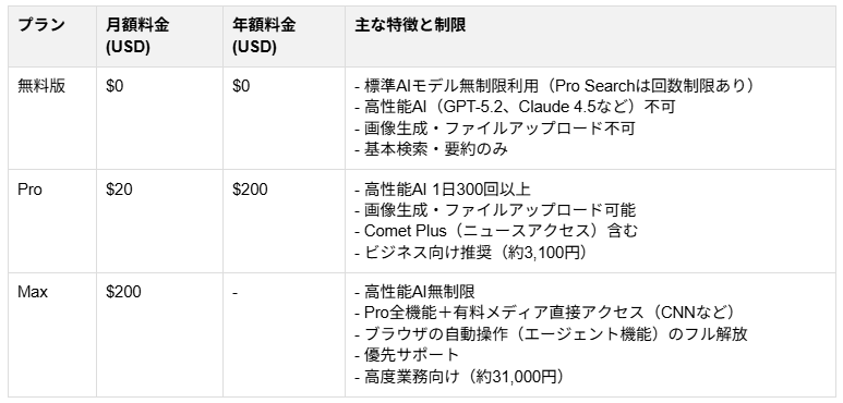 - Max版:Cometのエージェント機能をほぼ無制限に利用可能。