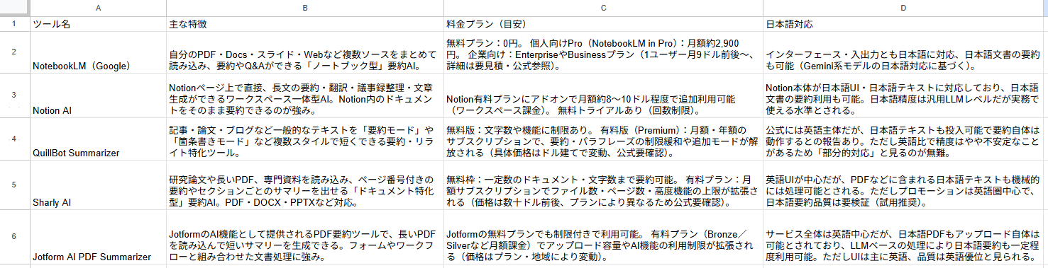 出力されたデータは、主要ツールを網羅しており、最新の料金改定や日本語対応の現状まで具体的に反映されています。