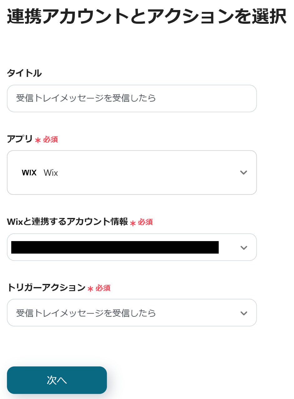最初にWixの設定から行うため、「受信トレイメッセージを受信したら」をクリックしてください。