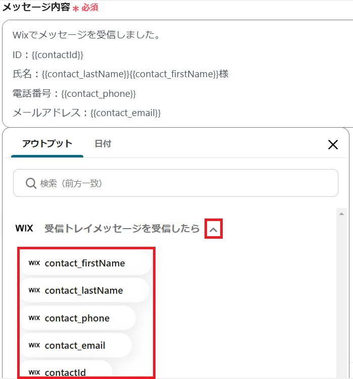 赤枠内の矢印をクリックすると、Wixのアウトプットを使用できます。