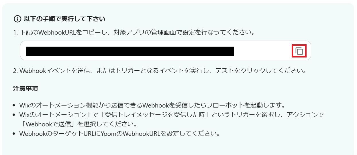 以下の画面が表示されたら、赤枠内をクリックし、Webhook URLをコピーしてください。