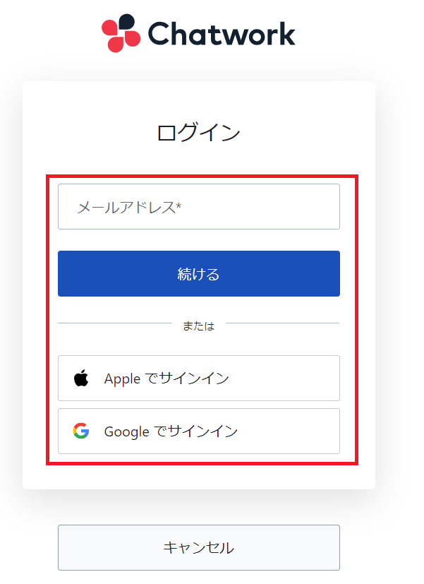 以下の画面が表示されるので、Chatworkにログインしましょう。