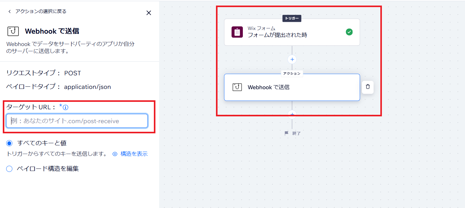 ターゲットURLに、Yoomのフローボット設定画面に出ているWebhookURLを入力しましょう。