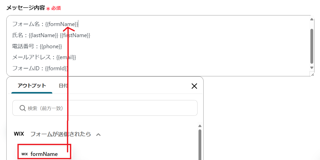 メッセージ内容には以下のように、アウトプットから選択してください。