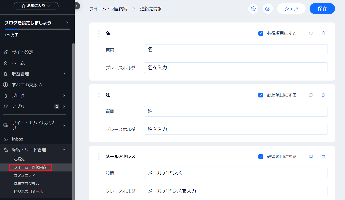 取得したい顧客情報の項目が設定された、Wixのフォーム。