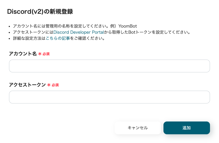 検索結果からDiscordを選択します。事前準備で得た値を入力する画面が表示されます。