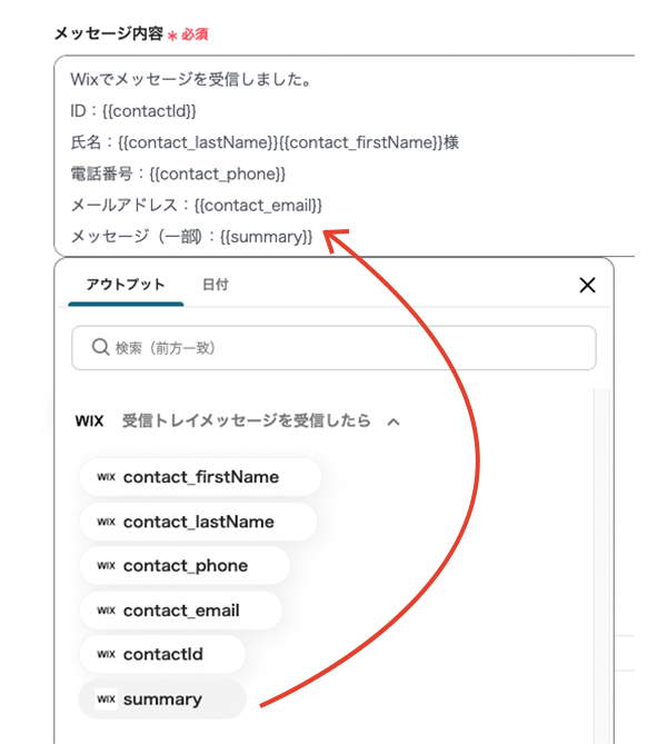 - 通知の定型文を作成します。編集欄をクリックすると、抽出したアウトプットがプルダウンに表示されます。アウトプットを選択すると、編集欄に引用コードが埋め込まれます。引用コードの手前に、項目を入力しておくとわかりやすくなります。
