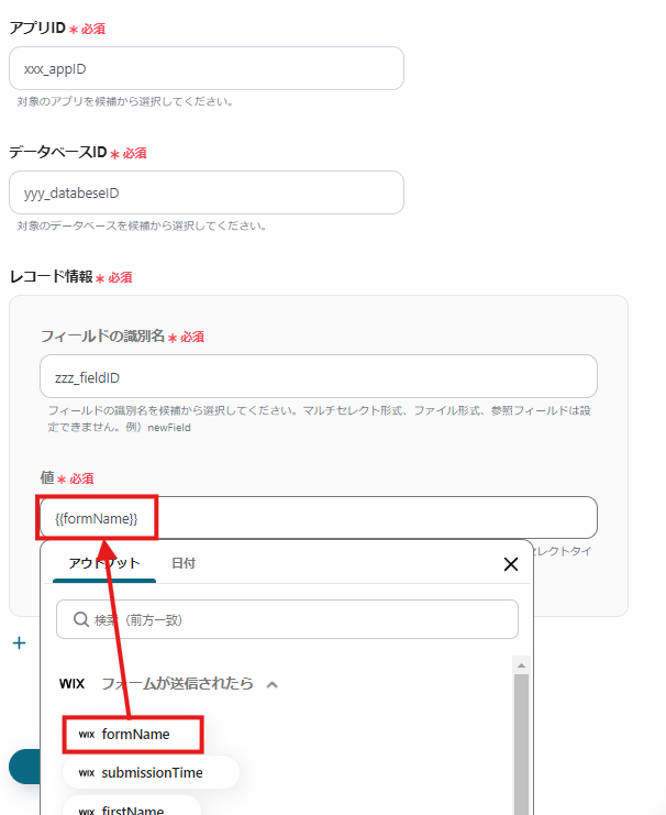 アウトプットされた情報を活用し、「アプリID」「データベースID」「レコード情報の各項目」を入力しましょう。