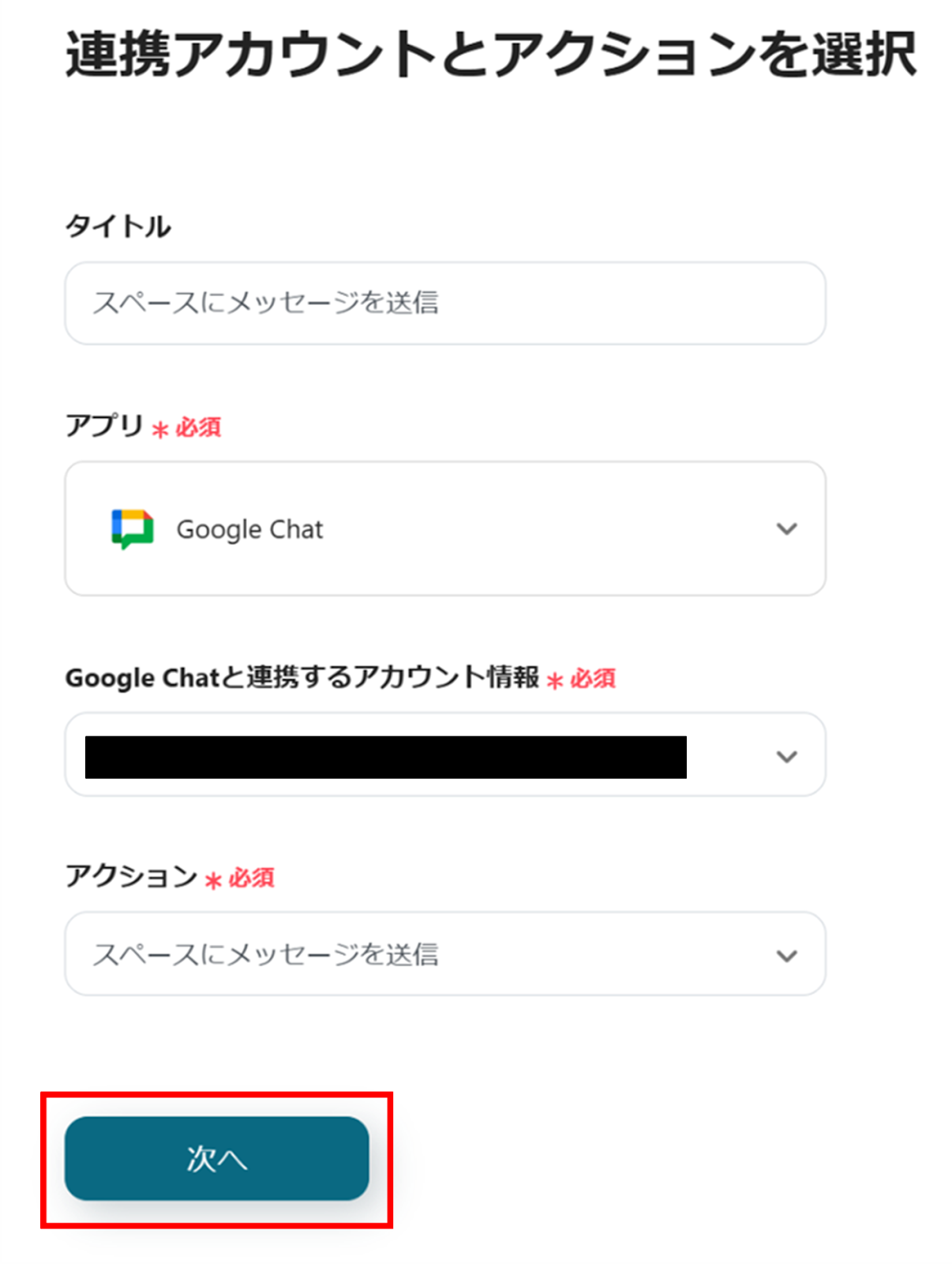 (2)Google Chatの「連携アカウントとアクションを選択」画面から、Google Chatと連携するアカウント情報に誤りがないかを確認し、アクションは「スペースにメッセージを送信」のままで「次へ」をクリックします。