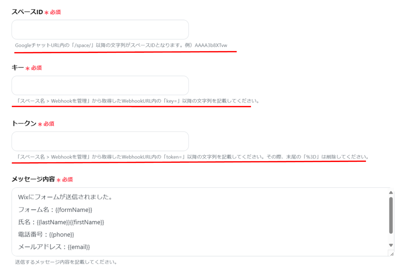 (3)「API接続設定」画面から、赤線を確認の上、スペースID、キー、トークン、メッセージ内容を入力します。