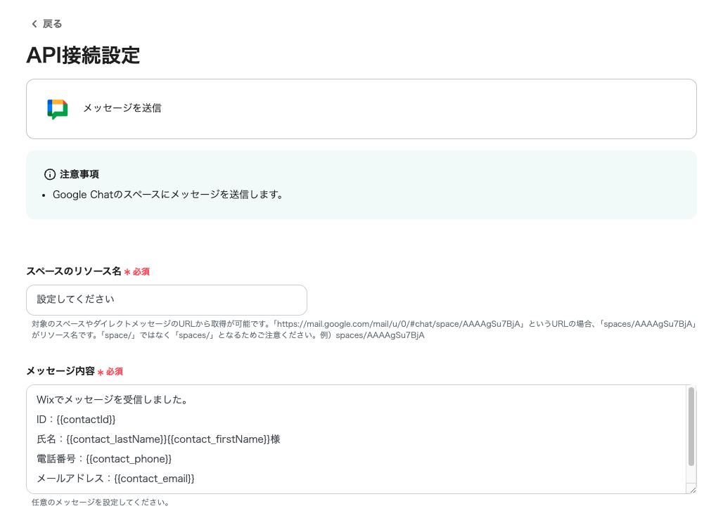 このプロセスではGoogle Chatへの通知内容を設定します。